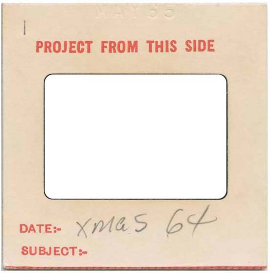 This project was an exploration of the physicality of historic photographic processes via old family slides. I found looking at the frames without the images and only vague handwritten descriptions and dates became more interesting than the images themselves. I wanted viewers to explore the physicality of the slide frames as objects while at the same time placing themselves inside the event the slide frame notes. I chose white rather than black to fill the space the slide would occupy to represent the screen or wall the images would be projects upon, thus allowing the viewer to project their own interpretation onto that space. The empty slides are printed large scale and hung on opposite walls of a hallway, this is intended to make the viewer an active participant within the narrative of the handwritten slide description, and prompt thoughts about the physicality of historic photographic processes.
